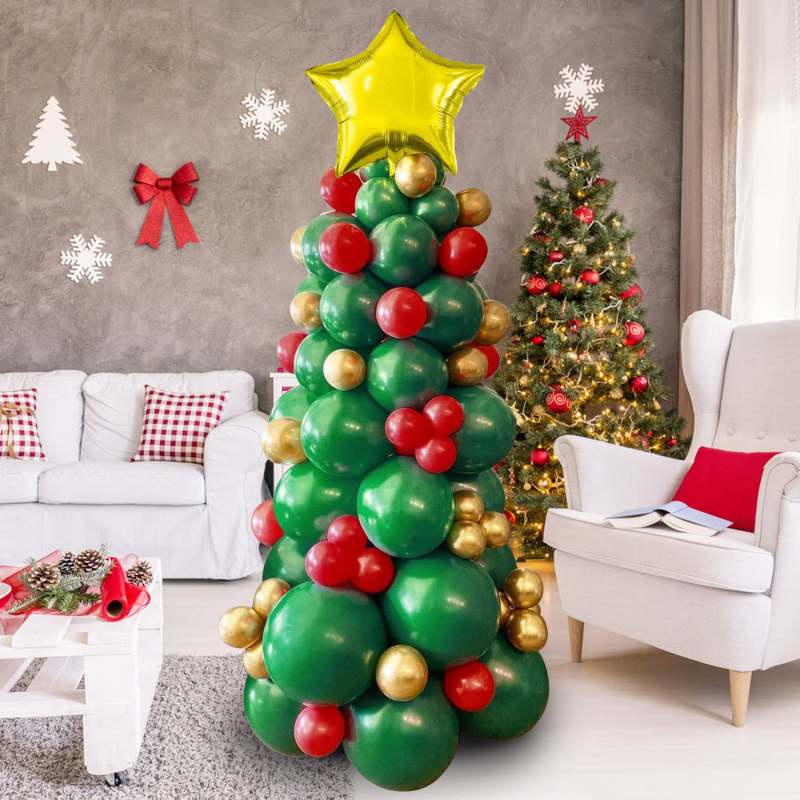 Christmas Balloon Garland Arch Kit – Festive Green, Red, and Gold Latex Balloons with Xmas Tree Balloons and Golden Starburst Accents for Holiday Party Decorations