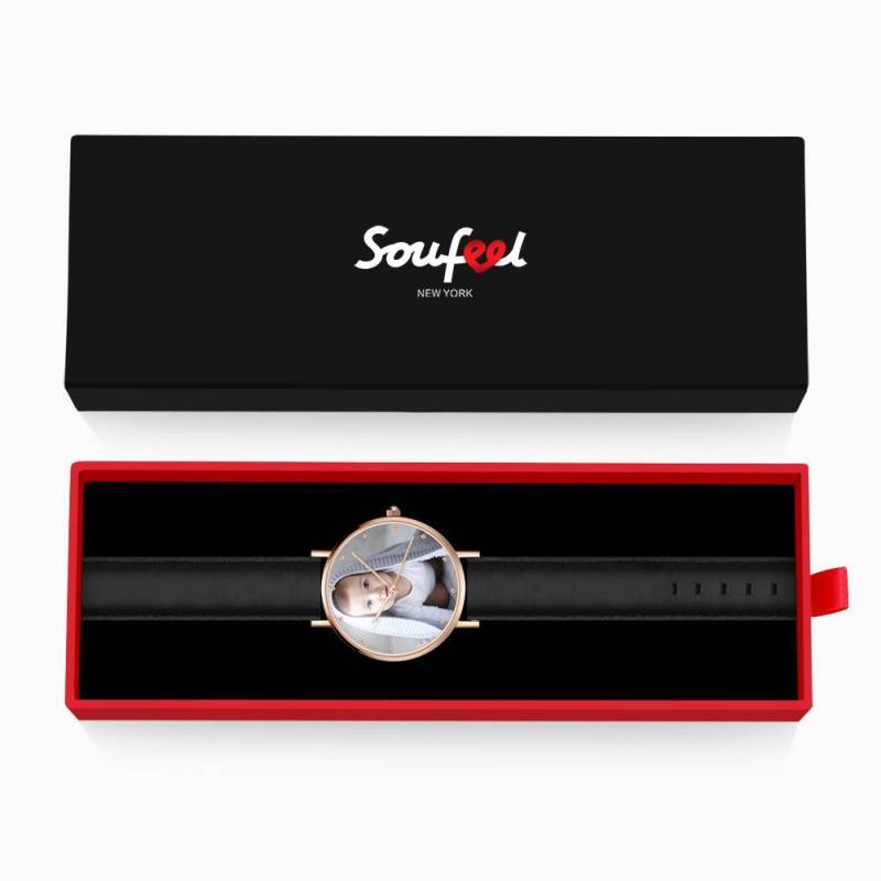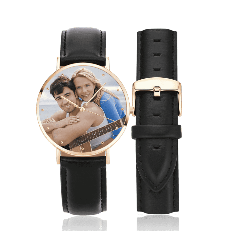 Custom Engraved Rose Gold Photo Watch Black Leather Strap