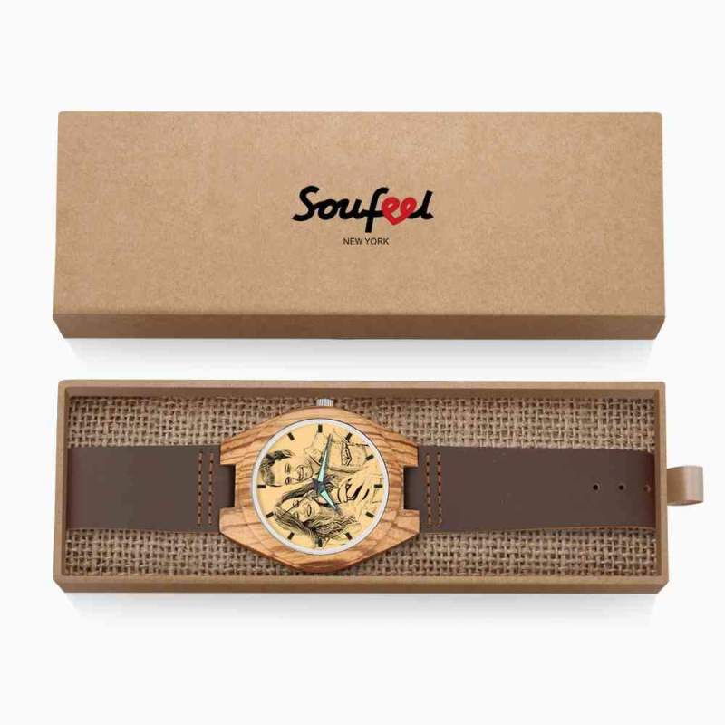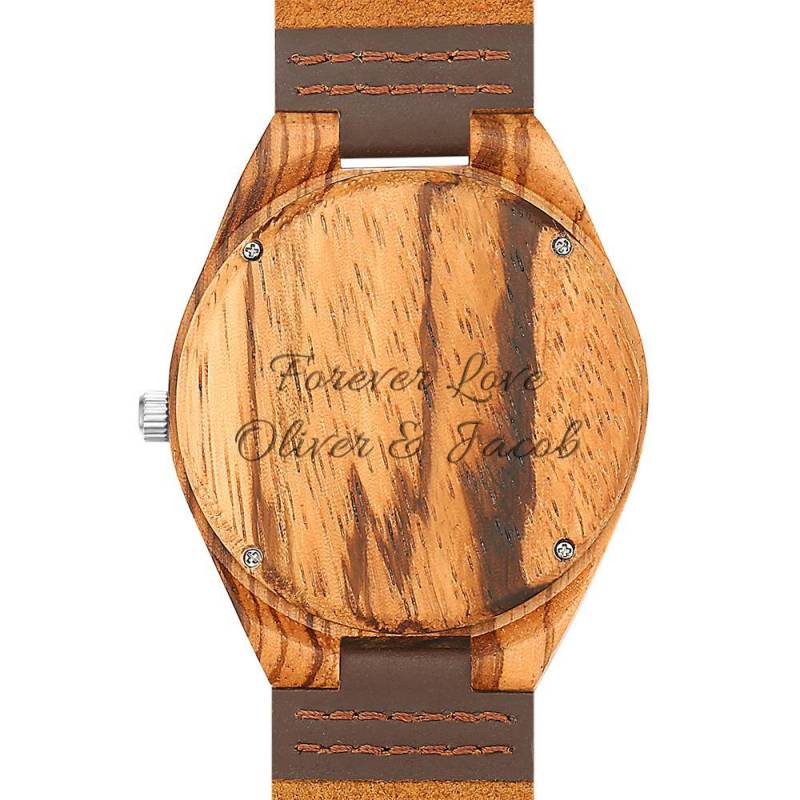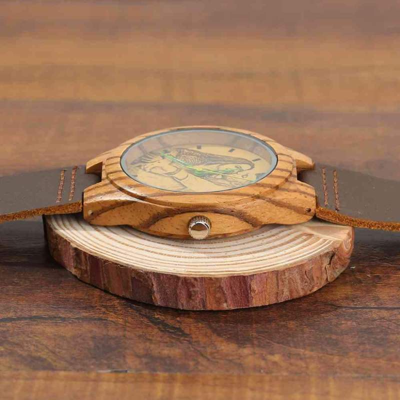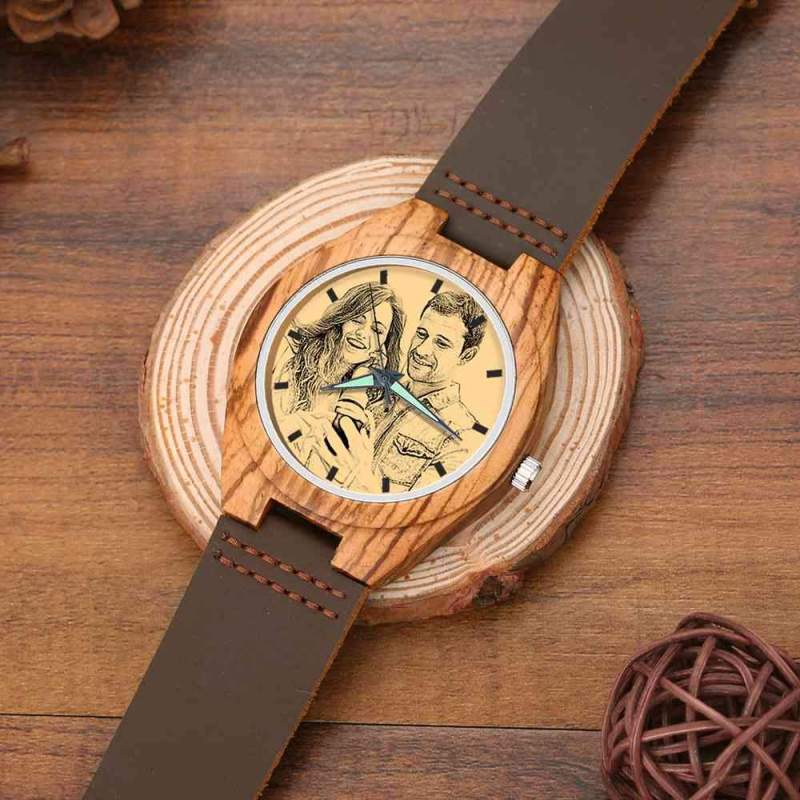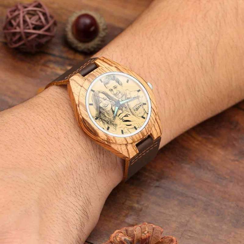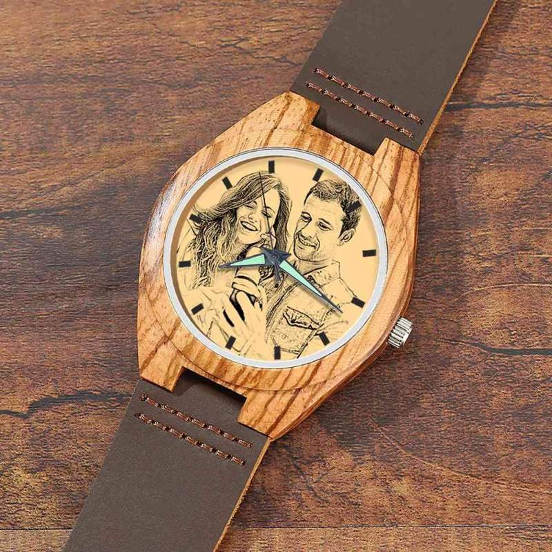 Custom Engraved Wooden Photo Watch Brown Leather Strap