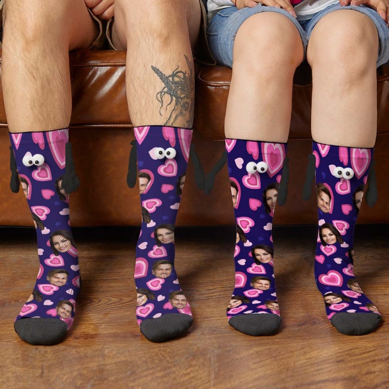 Custom Face Socks Funny Doll Mid Tube Purple Socks Magnetic Holding Hands Socks Pink Heart Valentine's Day Gifts
