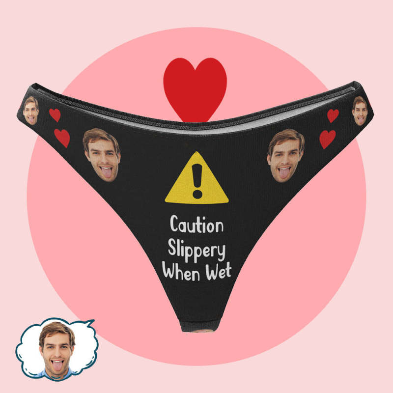 Custom Women's Panties Personalize Face Thong - Caution Slippery When Wet