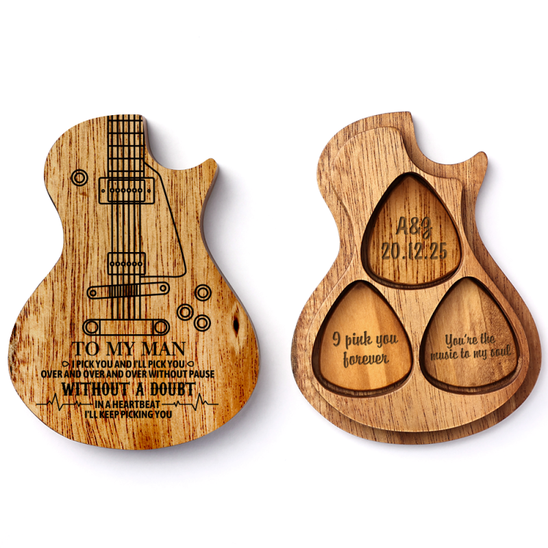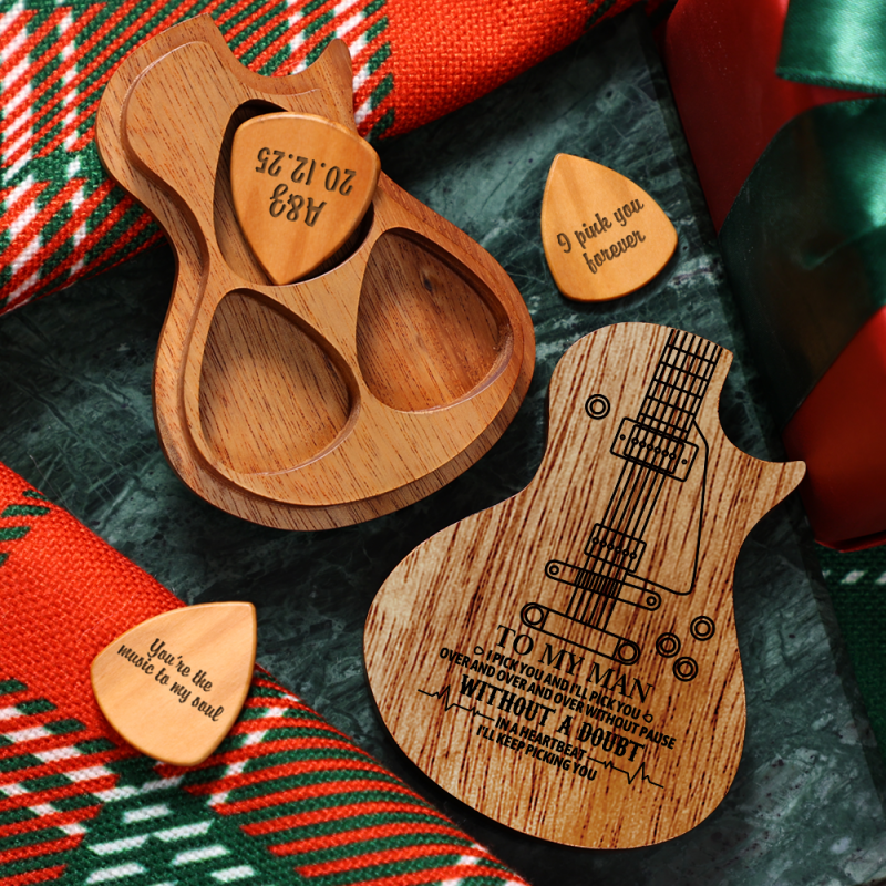 Personalized Wooden Guitar Picks & Pick Box - Electric Guitar